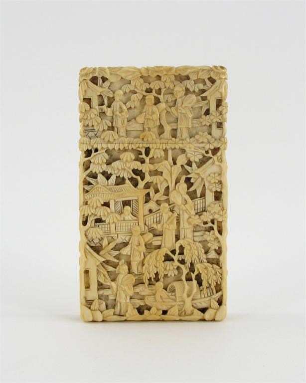 A Chinese Canton carved ivory card case, carved with figures in a pagoda landscape, 19th century, 9.5cm. (2)