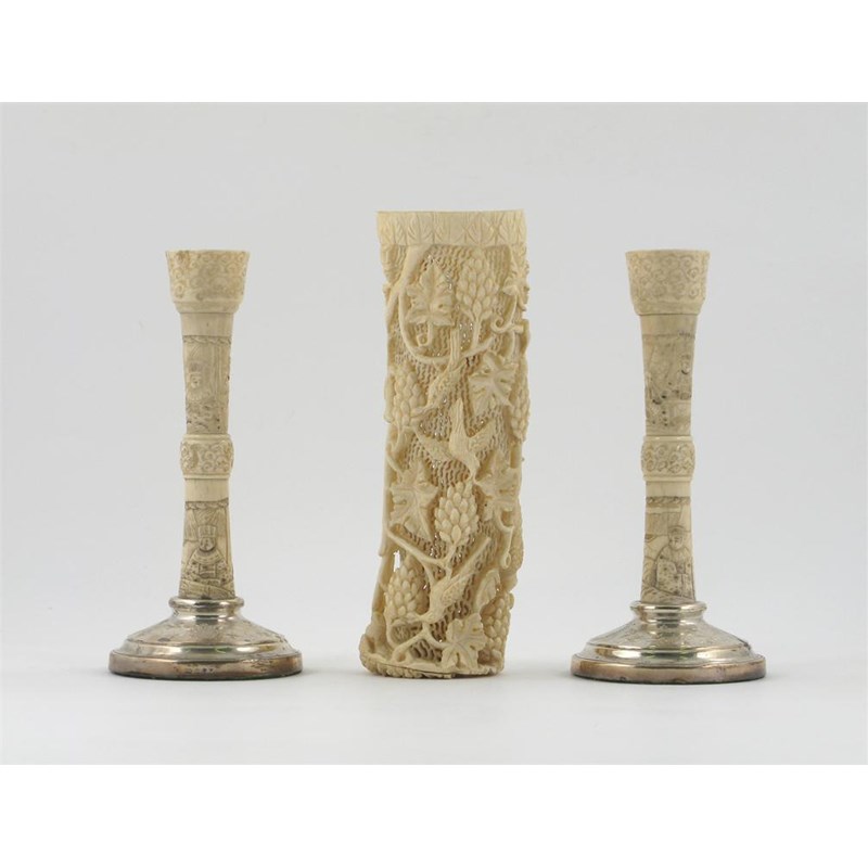 A pair of bone and silver candlesticks, carved with figures, the bases hallmarked for 1927, together with an ivory vase or perfumière, carved with birds amidst fruiting leafy branches, some damages, 23cm max. (3)