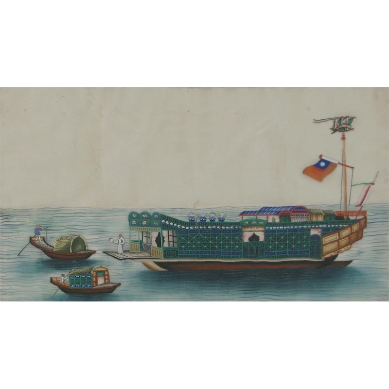 Five Chinese pith paper paintings, four depicting figures and one of a barge, and a Japanese woodblock print, 19th / 20th century, 34.5cm max. (6)
