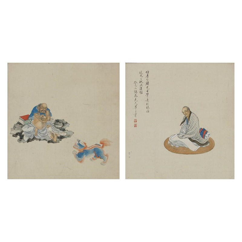 Two Chinese watercolours, depicting an immortal with a lion dog, the other with a seated scholar, the latter with three lines of calligraphy, 19th century, 26cm. (2)