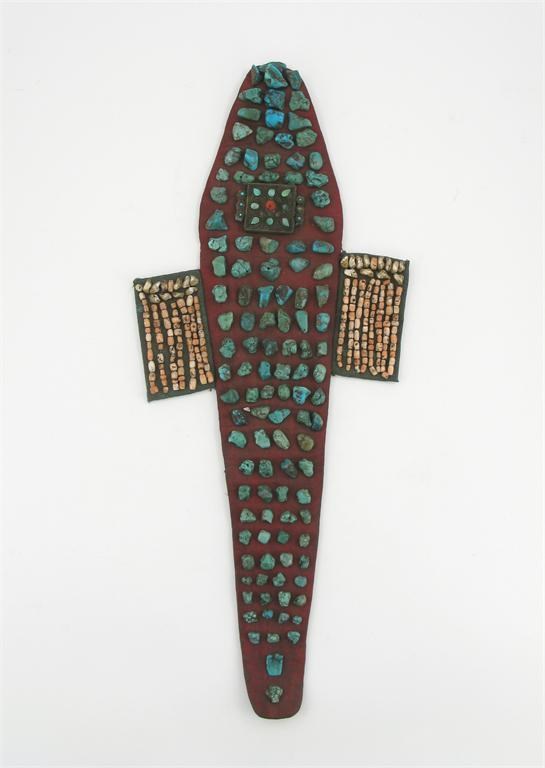 A Chinese perag, or woman's headdress, sewn with turquoise beads, coral and mother of pearl, 19th century, damaged and stained, 69cm.