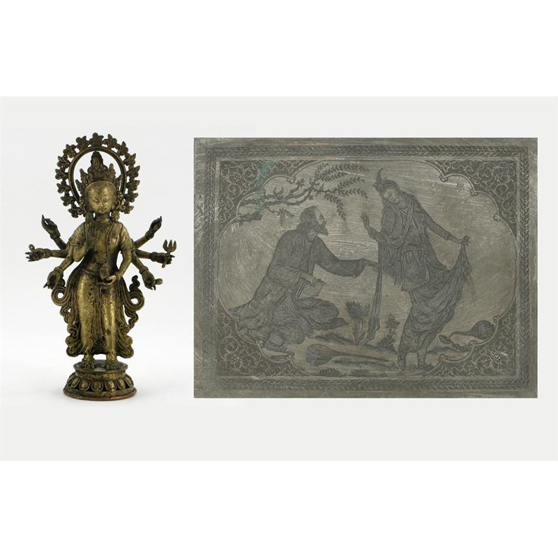 An Indian silvered copper panel, depicting a man kneeling before a standing woman, beneath a leafy branch, together with a standing bronze figure of Avalokitesvara, 33.5cm max. (2)