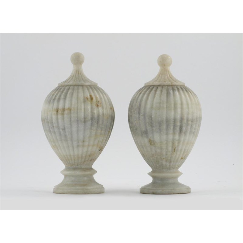 A pair of Middle Eastern white marble urns and covers, with ribbed ovoid bodies and circular pedestals, some damages and repairs, 24cm. (4)