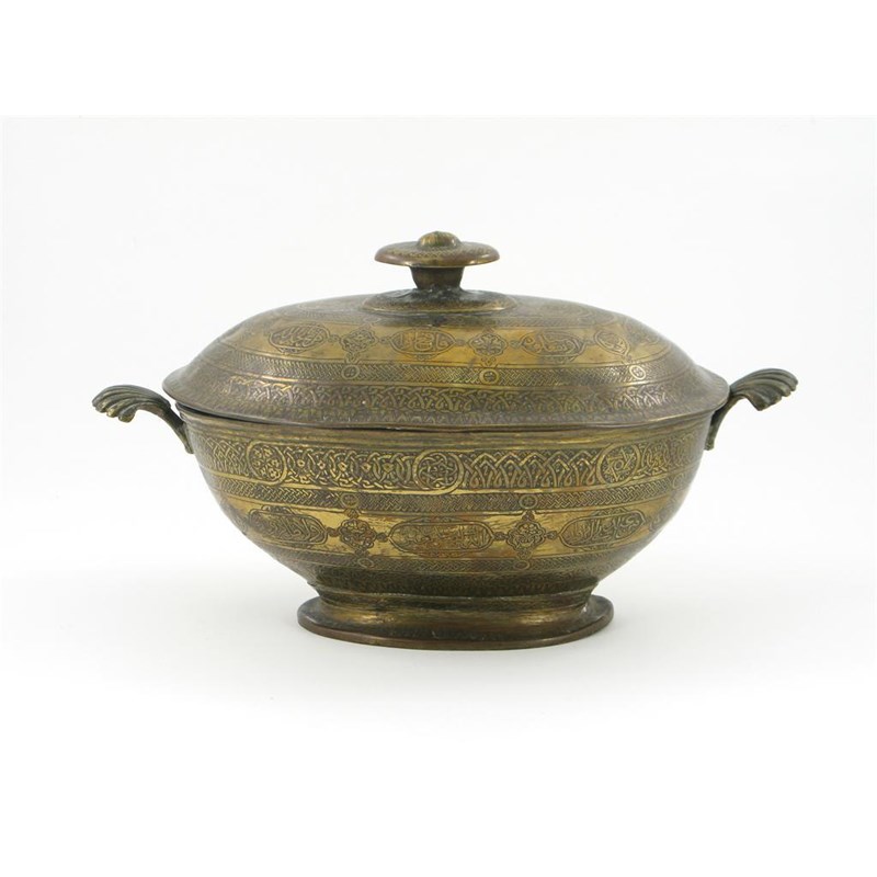 A Mamluk revival brass oval bowl and cover, decorated with panels of calligraphy and geometric designs, 19th century, 42cm. (2)