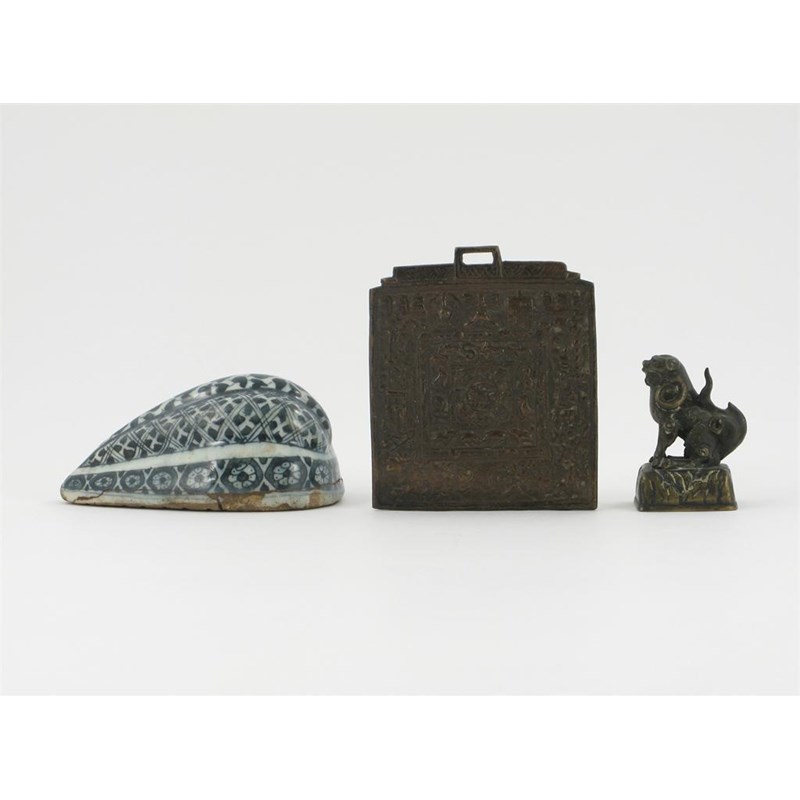 A Chinese bronze Buddhistic plaque, a bronze seal mounted with a lion dog, and a Middle Eastern pottery scraper, 17th century and later, damages, 11cm max. (3)
