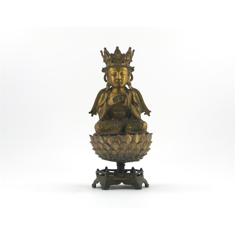 A Chinese gilt bronze figure of Guanyin, seated in dhyanasana, his crown with images of Buddha in each segment, raised on a lotus throne, late Ming, some wear, the stand possibly associated, 36cm. (2)