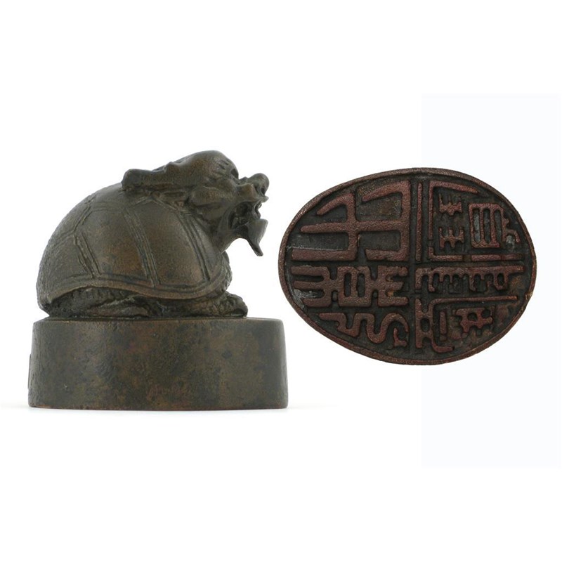 A Chinese bronze oval seal, surmounted by a mythical turtle, probably 18th century, 6.6cm.