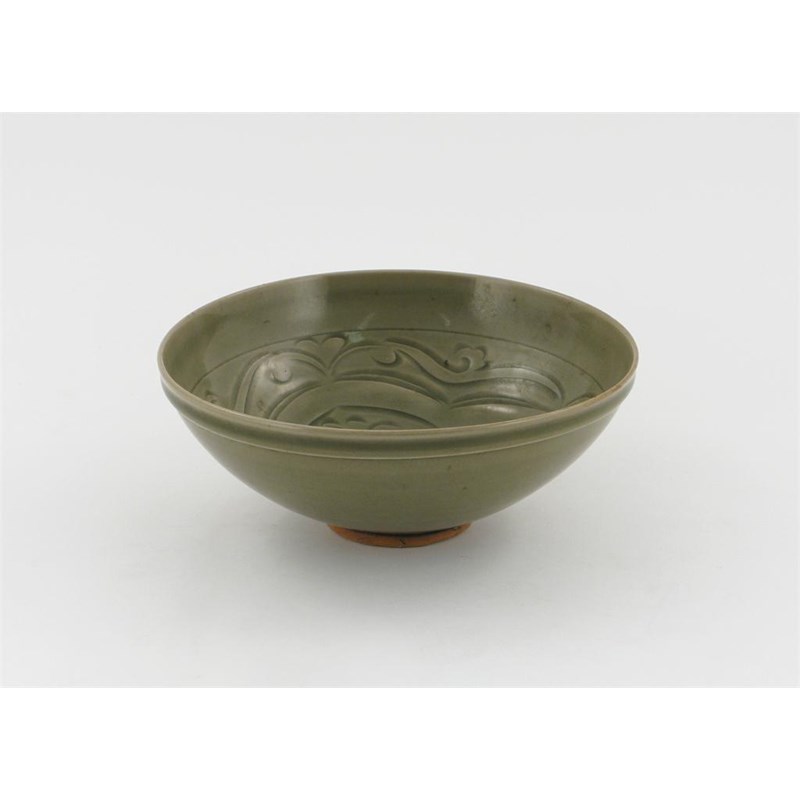A Chinese celadon bowl, finely carved with a central roundel and scrolling stylized foliage, 20.4cm.