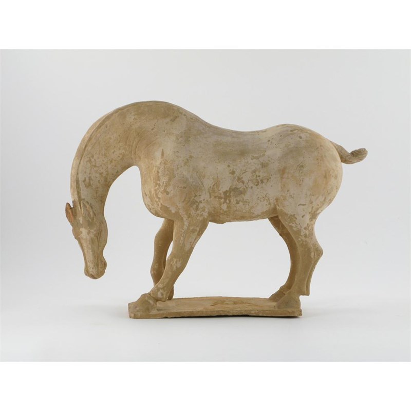A Chinese pottery model of an Imperial stallion in the Tang style, his head stretching towards the ground, damages, 47cm long.
