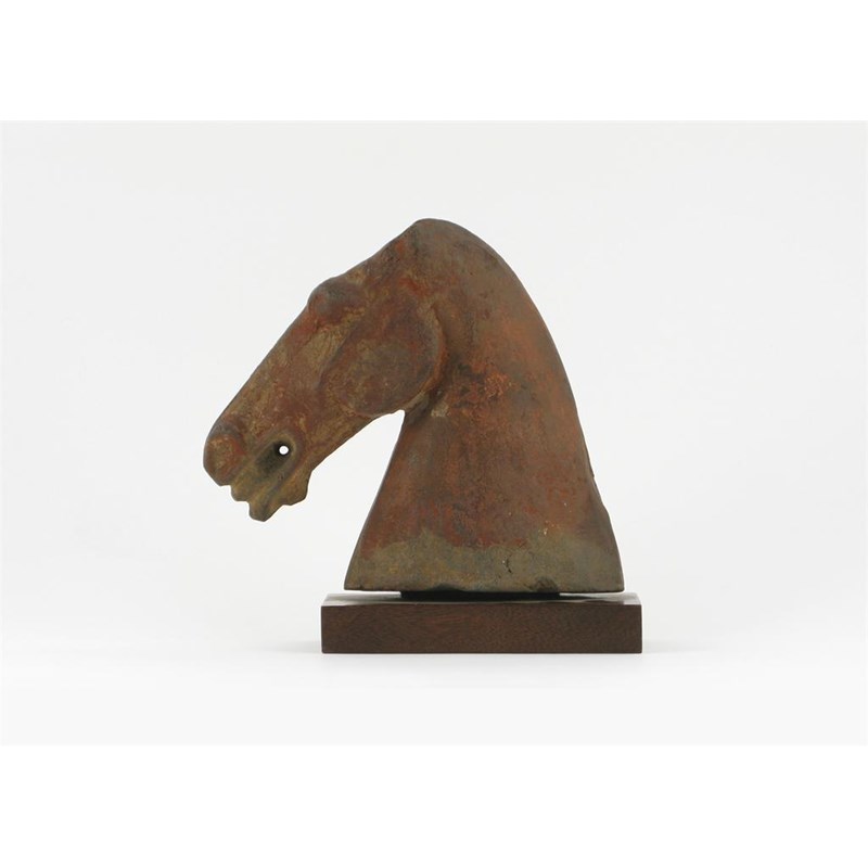 A Chinese model of a horse's head, with traces of red pigment, Han dynasty 206 BC - 220 AD, 15cm.