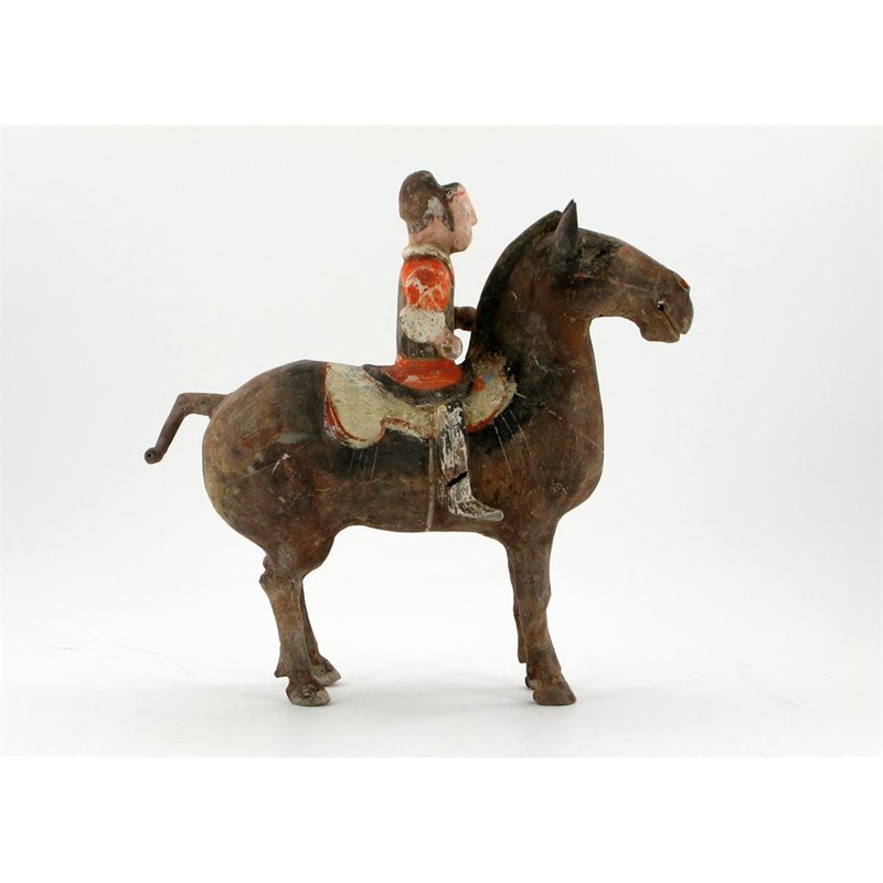 A Chinese pottery model of an equestrian, decorated with earth pigments, Han dynasty 206 BC - 220 AD, restoration, 36cm.