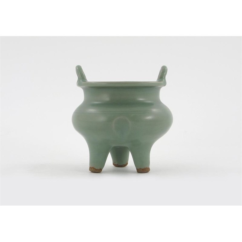 A Chinese celadon tripod censer, with rope twist handles and tall slightly flared legs, probably Song dynasty, 9cm.