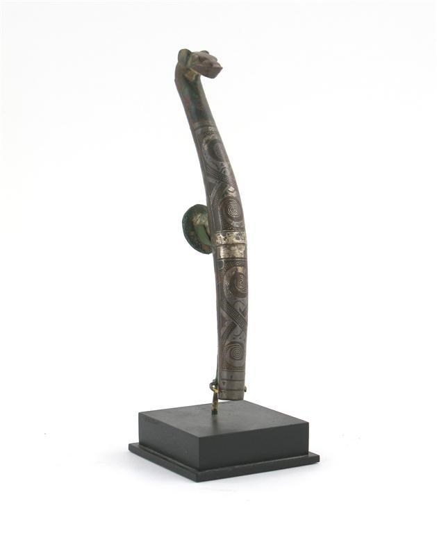 A Chinese bronze belt hook, inlaid in silver with scrolling geometric designs, the terminal formed as a panther's head, Han dynasty, 13cm.