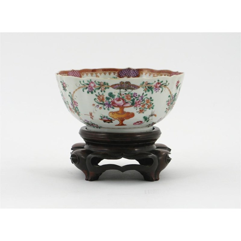 A Chinese famille rose bowl, delicately painted with butterflies and small insects, vases of flowers and scattered sprays, 18th century, 14cm. Together with a hardwood stand. (2)