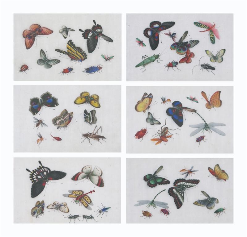 A set of six Chinese pith paper paintings, depicting butterflies, crickets, damselflies, wasps, beetles and other bugs, 19th century, 27cm. Framed and glazed. (6)