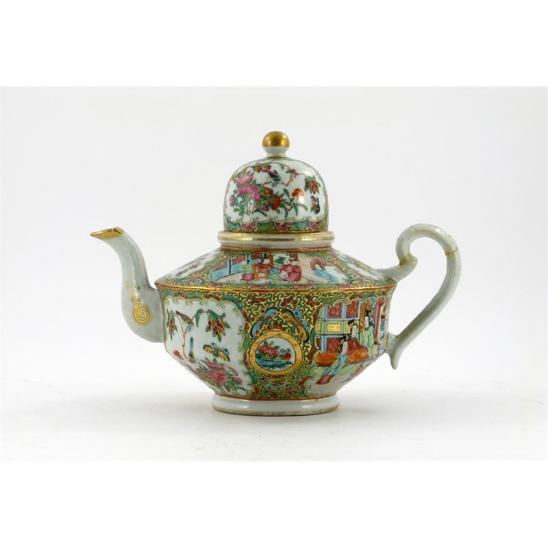 A Chinese Canton famille rose teapot and cover, typically decorated with colourful panels of figures, flowers, birds and fruit, 19th century, damages, 29.5cm. (2)