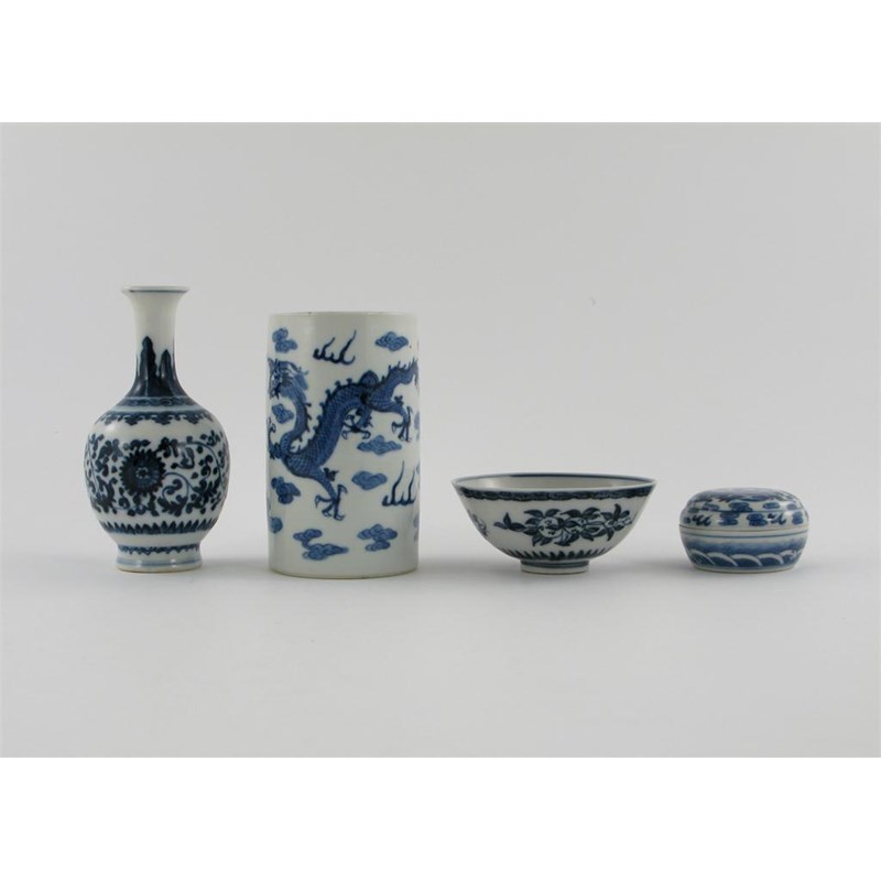 A Chinese blue and white cylindrical brush pot, painted with two dragons, a bottle vase painted in the Ming style, a bowl painted with fruiting sprays and a small box and cover, 13cm. (5)
