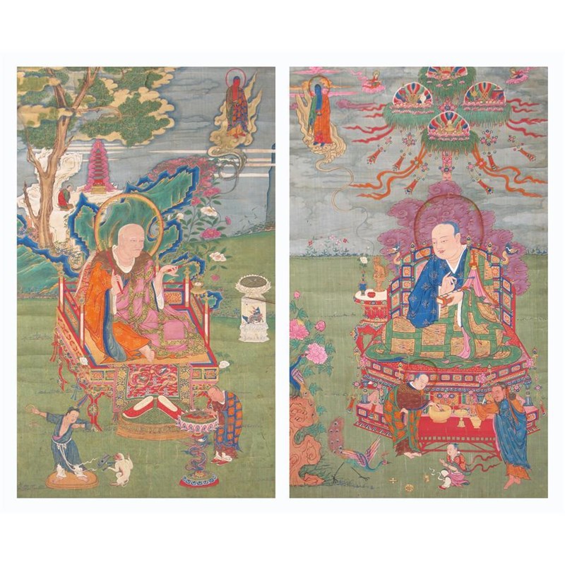 Two Tibeto-Chinese thankas, each depicting an arhat seated on a throne and attended by followers, one with the arhat Angaja who holds a fly whisk and censer, the other arhat Gopaka who holds a pustaka in his left hand, 19th century, 88cm. (2)