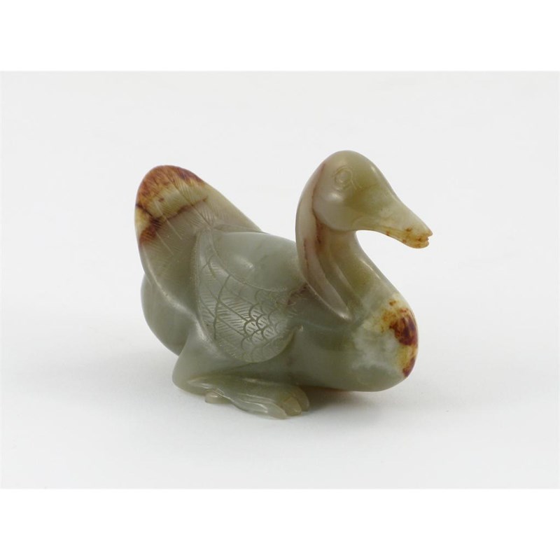 A good Chinese jade carving of a seated goose, crisply carved with detailed plumage, the celadon coloured stone mottled with brown skin to the breast and tail, 18th century, 8.5cm.