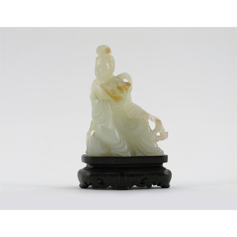 A small Chinese pale celadon jade carving of a seated lady, holding a fan, 18th / 19th century, 8.5cm. Together with a silver inlaid wood stand. (2)