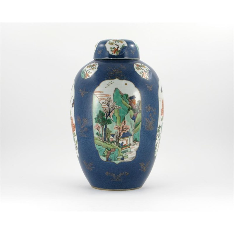 A large Samson famille verte ovoid vase and cover, painted with panels of figures in landscapes and birds, flowers and rockwork, on a powder blue ground heightened with gilt sprigs, lozenge mark, c.1880, 43cm. (2)