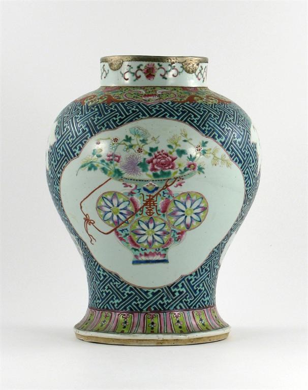 A Chinese famille rose baluster vase, painted with shaped panels containing vases of flowers on a complex diaper ground, 18th / 19th century, the rim with a later metal mount, minor faults, 35.5cm.