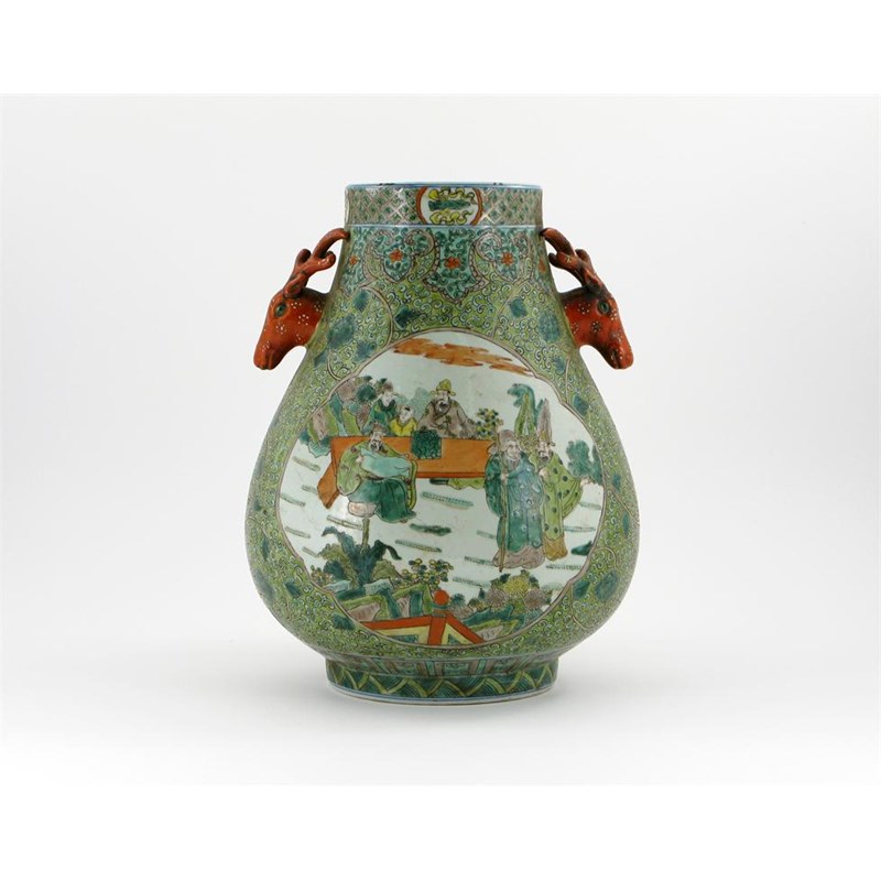 A Chinese hu-shaped vase, painted with panels of figures at tables and in gardens, and a green ground of scrolling foliage, the neck with a six character Guangxu mark but probably later, 36cm.