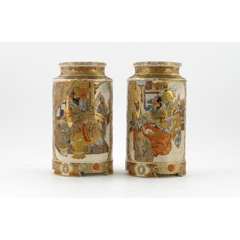 A pair of Japanese Satsuma cylindrical vases, each painted with panels of figures, unmarked, c.1900, 24.4cm. (2)