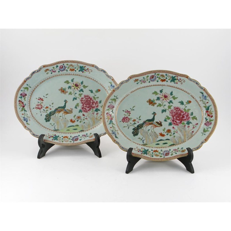 A pair of Chinese famille rose double peacock dishes, typically painted with the vain birds beneath flowers and foliage, 18th century, 41.7cm. Together with wood stands. (4)