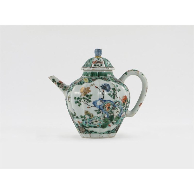 A Chinese famille verte teapot and cover, the ribbed body painted with flowers, foliage and rockwork, Kangxi 1662-1722, damage to the handle, spout and cover, 18cm. (2)