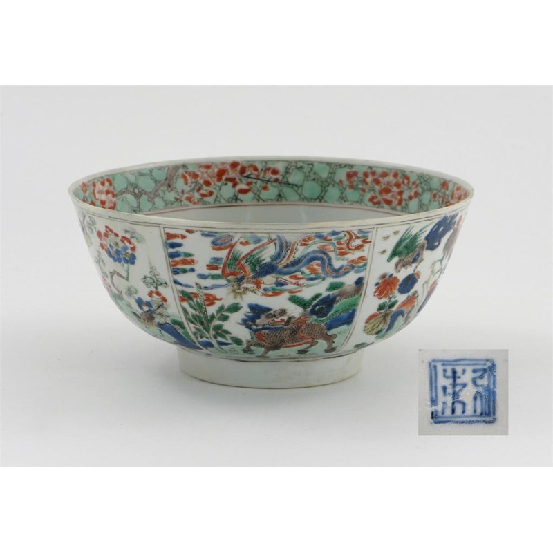A Chinese famille verte bowl, painted with panels containing storks, phoenix and mythical beasts amidst flowers and rockwork, a seal mark to the base, Kangxi 1662-1722, old restoration, 19.6cm.