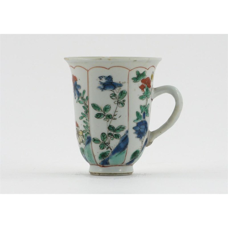 A Chinese famille verte deep U-shaped cup, decorated with panels of flowers and foliage, Kangxi 1662-1722, hairline cracks and damage to handle, 9cm.