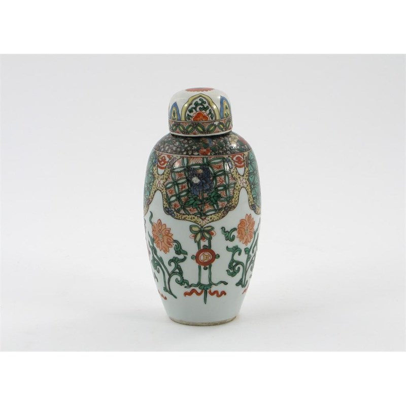 A Chinese famille verte ovoid vase and associated cover, fitted with a metal mount and cap, the body painted with panels containing flowers, the vase Kangxi 1662-1722, 17cm. (2)