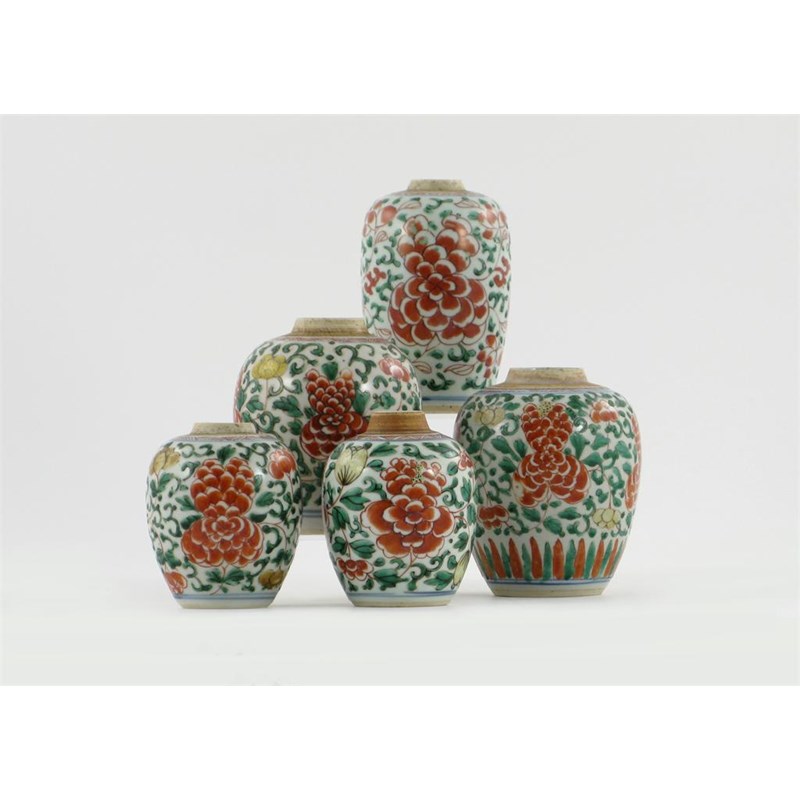 Five Chinese wucai ovoid vases, decorated with peony and leaf scroll, 2nd half 17th century, 13.5cm max. (5)