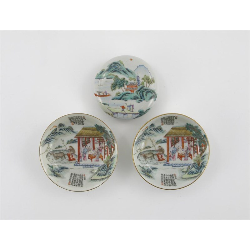 A pair of Chinese famille rose dishes, painted with figures in huts and ploughing with water buffalos, between panels of calligraphy, and a circular box and cover with figures in a mountain landscape, all with four character marks, 10cm max. (4)