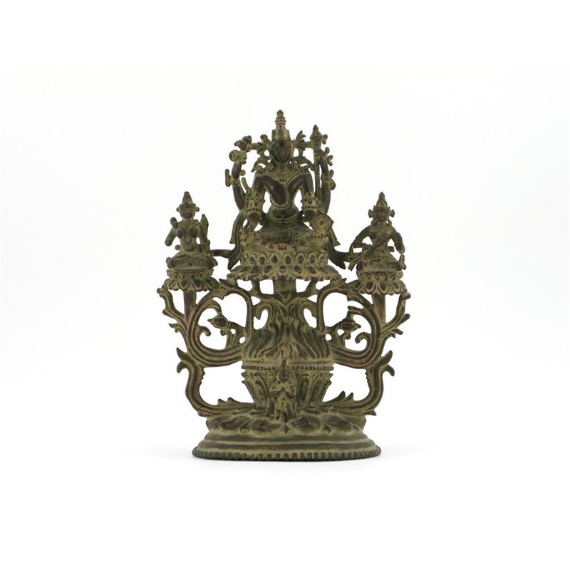 An Indian Pala-style bronze figure of Vishnu, with Sridevi and Bhudevi, seated in lalitasana mudra, with attendants on either side, and a devotee kneeling on the circular lotus petal base, 26.8cm.