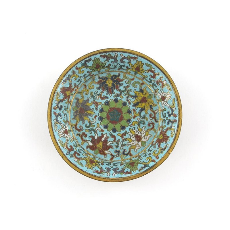 A Chinese cloisonné circular dish, with a flared rim, decorated with lotus on a pale blue ground, the borders gilded, Qianlong 1736-95, 9.8cm.