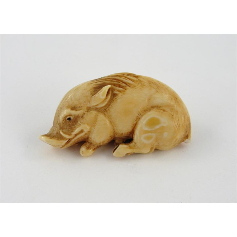 A Japanese ivory netsuke of a recumbent wild boar