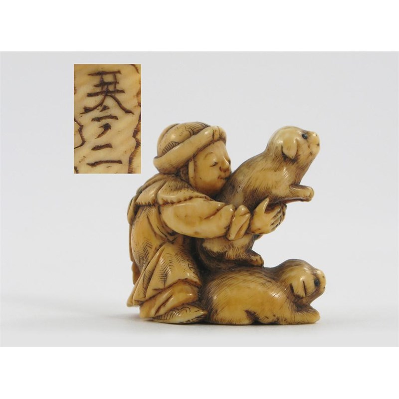 A Japanese ivory netsuke, carved as a boy clutching two puppies, the base with a two character signature, Meiji 1868-1912, 3.5cm.