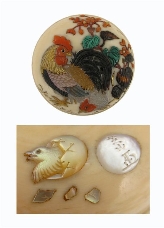 A Good shibiyama manju netsuke, inlaid with coral, mother of pearl, and tortoiseshell with a cockerel and hen, the reverse with a hatching chick, and a two character signature, 19th century, 3.5cm.