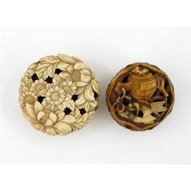 Two Japanese ivory netsukes, one a manju netsuke pierced and carved with flowerheads, the other a ryusa with a mallet, a mouse, fans and scrolls, 19th century, 5cm. (2)