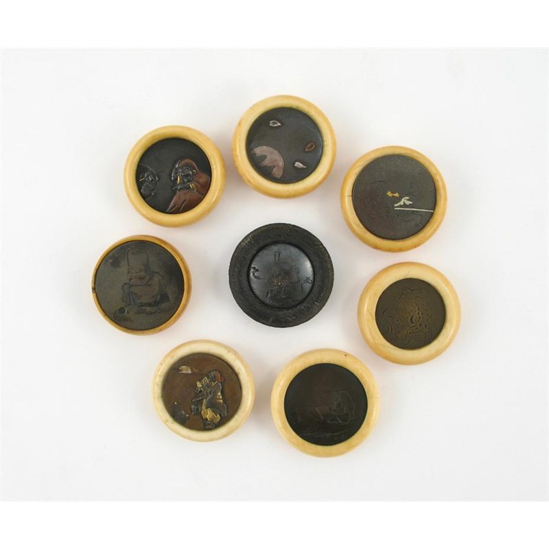 Eight Japanese kagamibuta netsukes, five ivory and one wood, the metal plates decorated with figures, frogs, a rabbit and a setting sun, 19th century, 4.4cm max. (8)