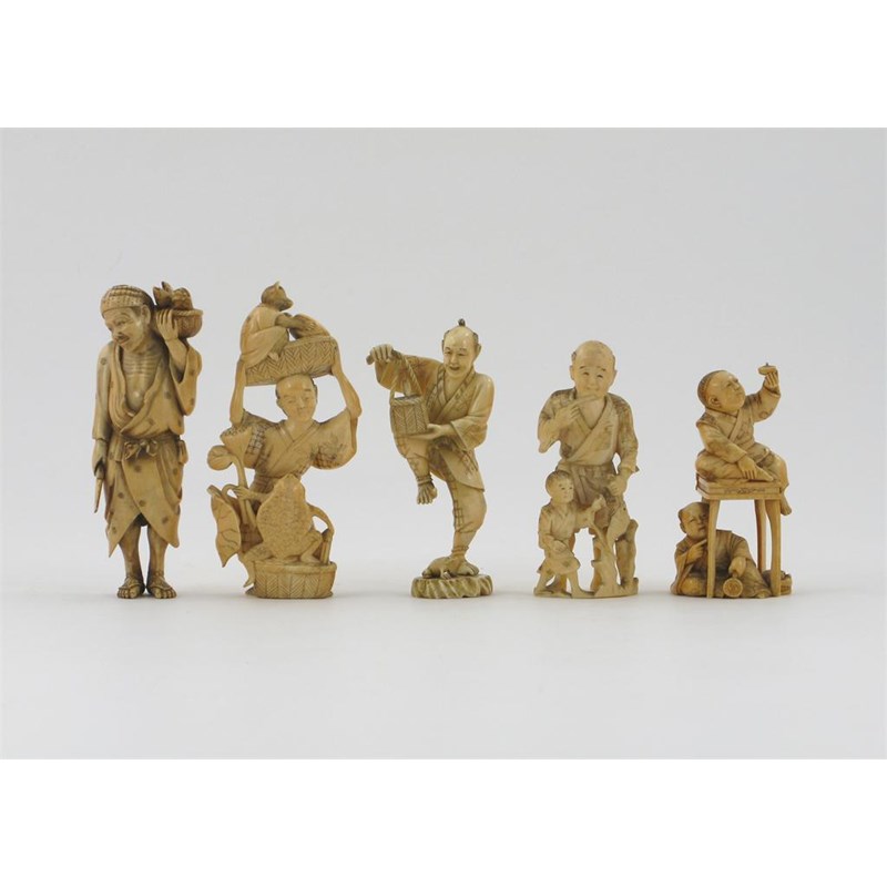 Five small Japanese ivory carvings of figures, with children and animals in various pursuits, one with a two character mark, all Meiji 1868-1912, some damages, 12cm max. (5)
