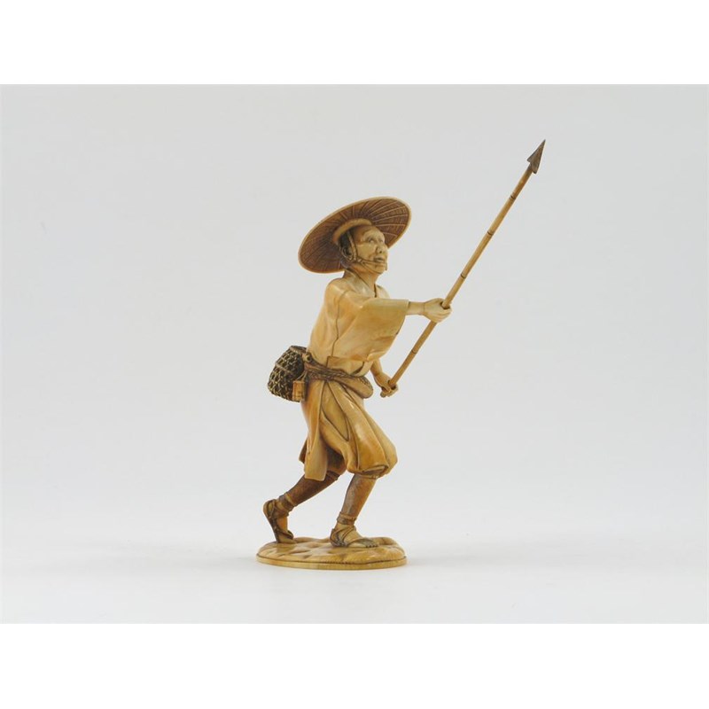 A Japanese ivory carving, of a peasant wearing a wide-brimmed straw hat and holding a spear, the base inset with a two character signature, Meiji 1868-1912, 17.5cm (excluding the spear).