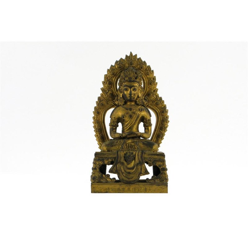 A Chinese gilt bronze figure of Amitayus, dressed as a Bodhisattva seated in dhyanasana on a square base in front of a flaming mandala, his hands in dhyanamudra, Qianlong nine character mark, bearing the date 1770 and probably of the period, 21cm. (2)