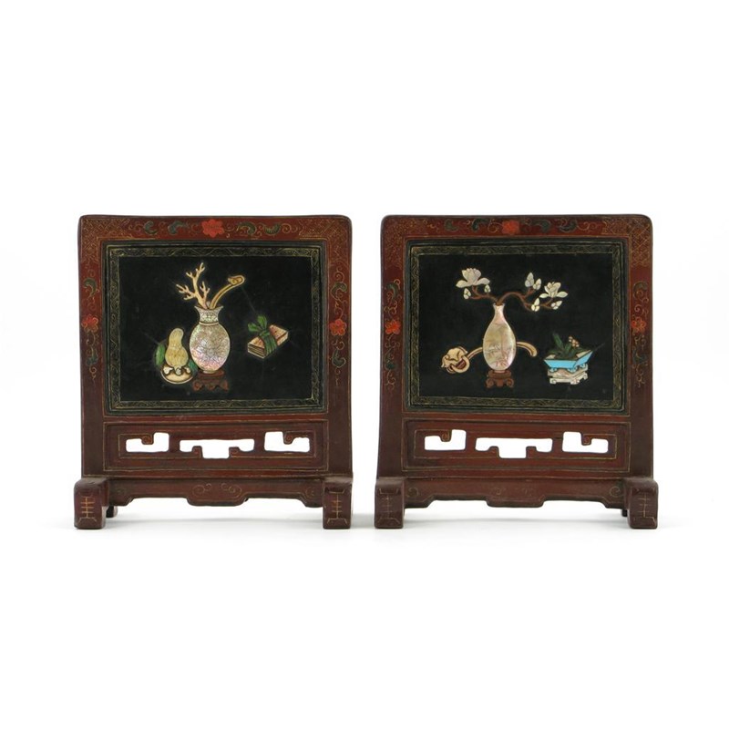 A pair of Chinese lacquer table screens, inset with mother of pearl and ivory and decorated with vases and auspicious objects, 19th century, 22.5cm.