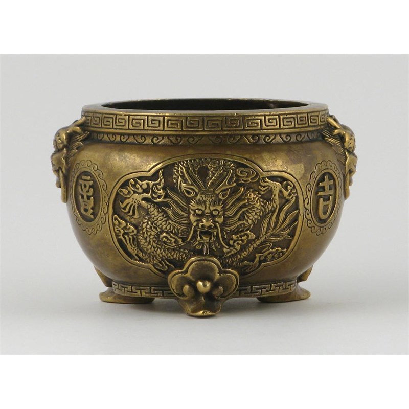A Chinese bronze tripod incense burner, cast with panels of dragons and phoenix and auspicious characters, six character Xuande marks but 18th/19th century, 12cm.