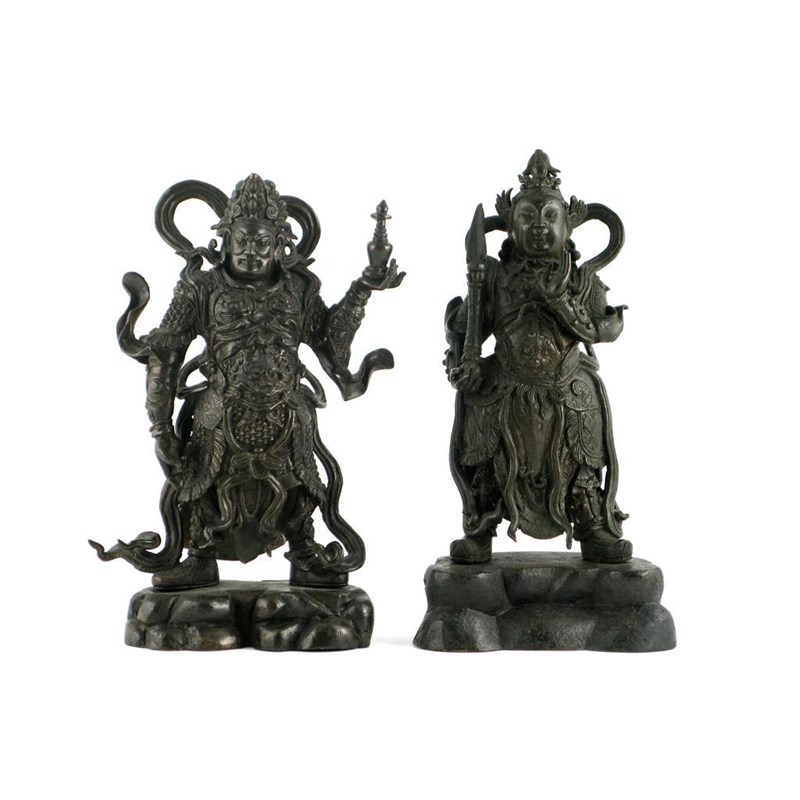 Two Chinese bronze Daoist guardian kings of heaven, both wearing heavy armour, the king Wen holding a spiked club and his left hand in a gesture of peace, the king Li holding up a stupa, late Ming dynasty, 29cm max. (2) Known as the Si Tianwang, who resided on Mount Sumeru, the centre of the universe, they are the protectors of the world and fighters of evil; each able to command a legion of supernatural creatures.