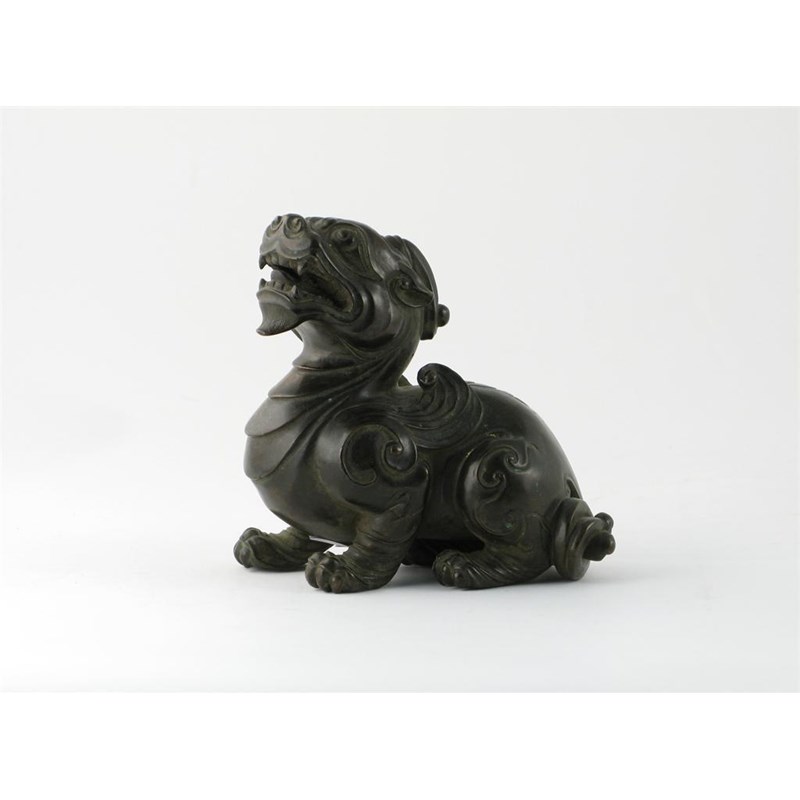 A Chinese bronze model of a crouching horned lion dog, baring its teeth, 17th/18th century, 14cm.