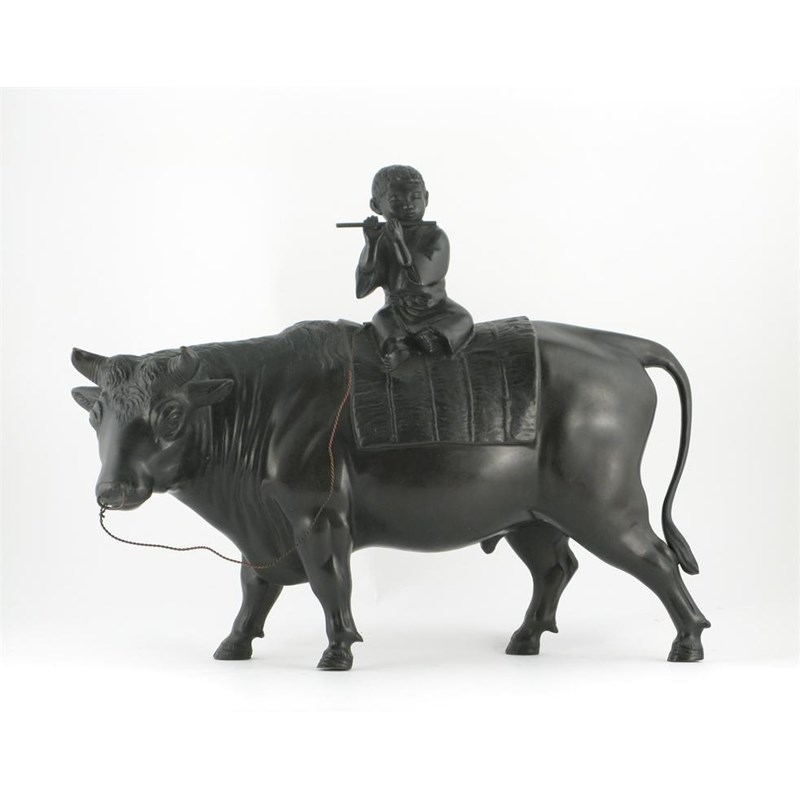 A large Japanese bronze model of a bull, his back with a small boy sitting playing a flute, probably Meiji period, 51cm.